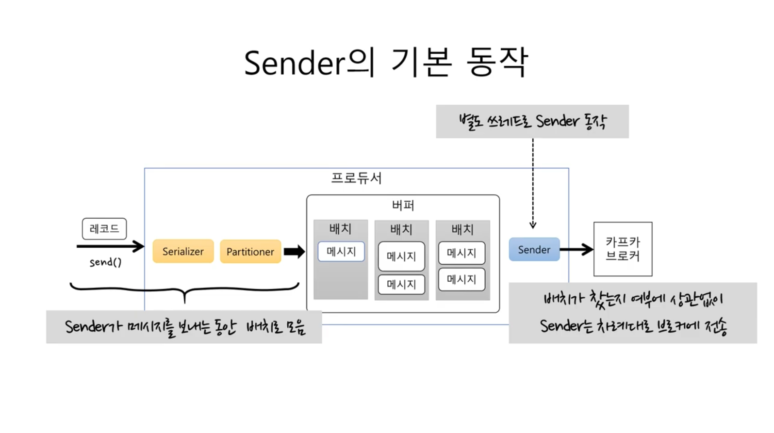 - 프로듀서: 일정 크기만큼 메시지를 모아서 전송 가능