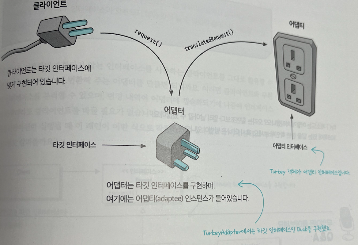 어댑터 패턴은 한 클래스의 인터페이스를 클라이언트에서 사용하고자 하는 다른 인터페이스로 변환한다. 어댑터를 이용하면 인터페이스 호환성 문제 때문에 같이 쓸 수 없는 클래스들을 연결