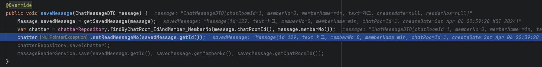 메시지를 저장하고, 그 이후의 데이터를 처리하는 과정에서 NPE가 발생했고,