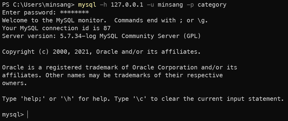 생성한 DB에 특정 계정으로 접속할때는 아래와 같은 명령을 사용하면 됩니다.